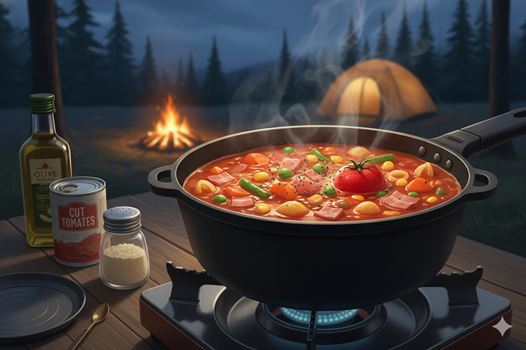 カットトマト缶は、キャンプで本格的な煮込み料理を作る際の強い味方です。 野菜やベーコンと一緒に煮込むだけで、野菜の甘みとトマトの酸味が溶け込んだ、栄養満点のミネストローネが完成します。少し肌寒い夜や、キャンプの朝食に、体を芯から温めてくれる優しい味わいのスープです。