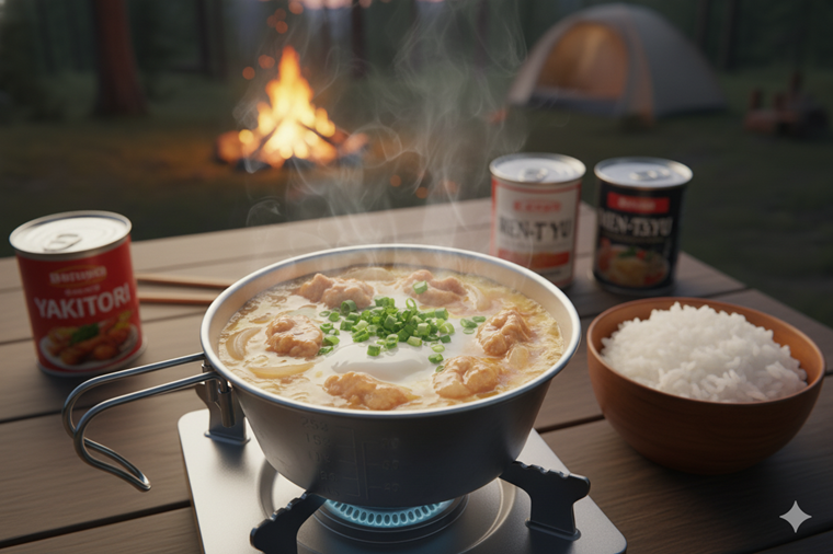 キャンプの〆やソロキャンプの食事にぴったりなのが、シェラカップ一つで完結する親子丼です。 やきとり缶のしっかりした味を活かすので、めんつゆ少量で味が決まります。洗い物が少なく済むのも嬉しいポイントです。