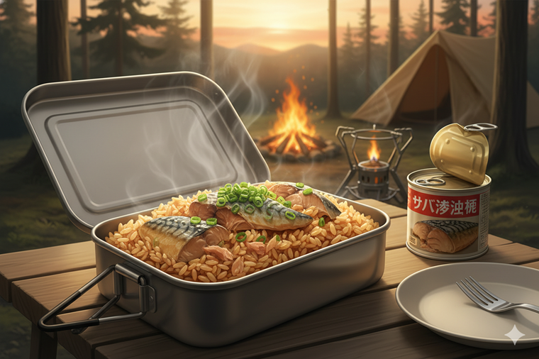 キャンプギアの定番「メスティン」を使えば、サバ缶の炊き込みご飯も簡単に作れます。サバ缶の旨味とタレがご飯一粒一粒に染み渡り、おかわり必至のおいしさです。 醤油煮缶や味噌煮缶など、使う缶詰の種類で味わいが変わるのも魅力です。