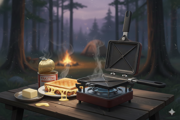 キャンプの朝食にぴったりの、ボリューム満点ホットサンドです。 ホットサンドメーカーを使えば、外はカリッと、中はジューシーに仕上がります。マヨネーズの酸味とやきとりの甘辛いタレが絶妙にマッチします。