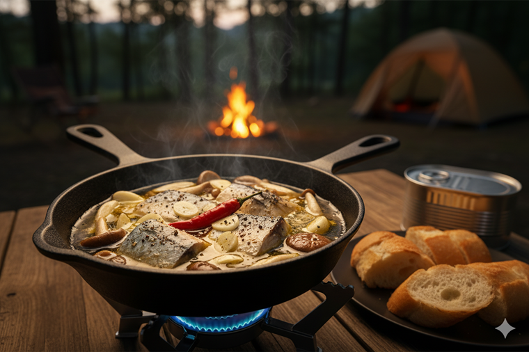 キャンプの夜を彩るおしゃれな一品、サバ缶アヒージョ。スキレットひとつで調理が完結し、バゲットを添えれば立派なメインディッシュになります。サバの旨味が溶け出したオイルは、最後の一滴まで楽しめます。