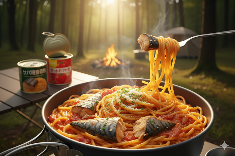 意外な組み合わせに思えるサバの味噌煮とトマトですが、実は相性抜群。味噌のコクとトマトの酸味が合わさり、お店のような濃厚な味わいのパスタがワンパンで完成します。 茹で汁をそのままソースに活用するので、洗い物が少なく済むのもキャンプでは嬉しいポイントです。