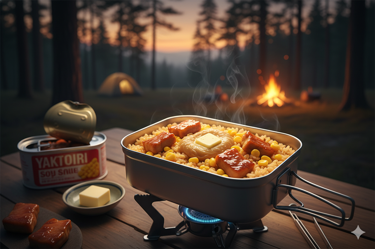 メスティンを使った炊き込みご飯はキャンプ飯の王道です。 やきとり缶とコーンを使えば、子どもから大人までみんな大好きな、間違いのない味に仕上がります。バター醤油の香ばしい香りが食欲をそそります。