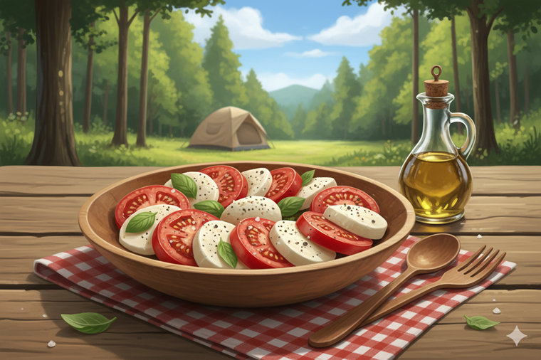 スライスしたトマトとモッツァレラチーズを交互に並べ、オリーブオイル、塩、黒こしょうをかけ、ちぎったバジルを添えます。キャンプ場に向かう途中の道の駅などで、新鮮な地元のトマトを調達して作るのがおすすめです。