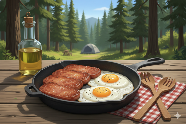 スキレット(鋳鉄製のフライパン)は、蓄熱性が高く食材の旨味を最大限に引き出してくれる、アウトドア調理の万能アイテムです。調理後にそのままテーブルへ並べるだけで、カフェのようなおしゃれな雰囲気を演出できるため、写真映えを狙いたいキャンプ飯に欠かせません。