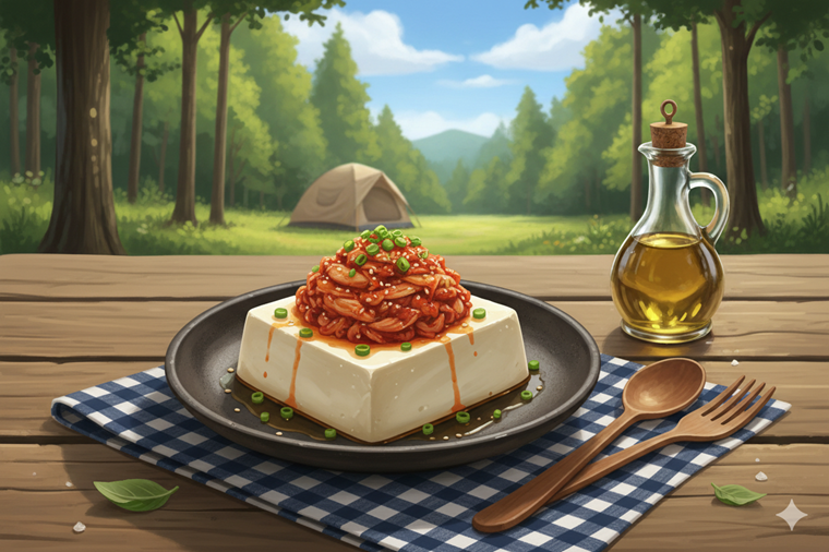 水気を切った豆腐をお皿に盛り、キムチをのせてごま油を回しかけ、刻みネギを散らします。調理工程がほぼゼロなので、テント設営後すぐに乾杯したい時のお供として大活躍する一品です。