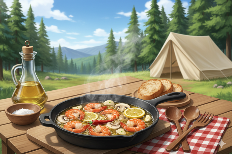 キャンプ飯の定番であるアヒージョに、フレッシュなレモンの酸味を加えて夏らしくさっぱりと仕上げたアレンジレシピです。ニンニクの食欲をそそる香ばしい香りとレモンの爽やかさが、夏の暑さで疲れた体をリフレッシュさせてくれます。カリッと焼いたバゲットを添えて、魚介の旨味が溶け込んだオイルを最後の一滴まで楽しみましょう。