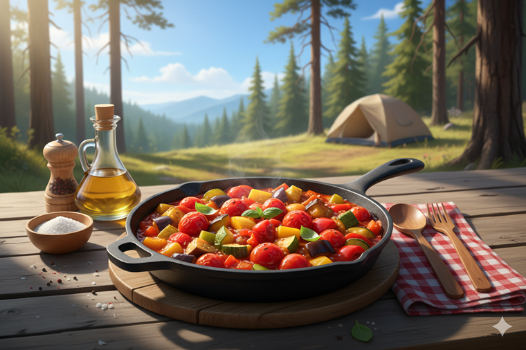 トマトやズッキーニ、ナスといった旬の夏野菜をふんだんに使ったラタトゥイユは、鮮やかな彩りがスキレットの黒色に美しく映える一品です。野菜が持つ水分だけでじっくりと煮込むため、素材の甘みと旨味が凝縮されて栄養も満点です。熱々のままでも、少し冷ましてからでも美味しくいただけるため、夏のキャンプにぴったりです。