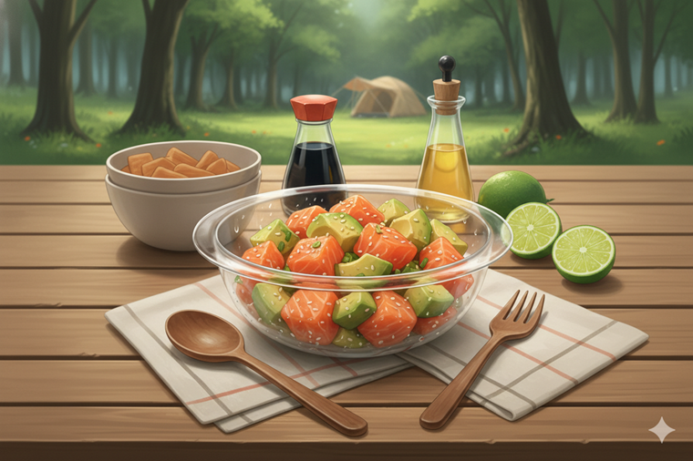 ハワイの定番料理「ポキ」を、アウトドア向けにアレンジした一品です。濃厚なアボカドとサーモンにごま油の香りが絡み、暑い夏でも食欲をそそります。