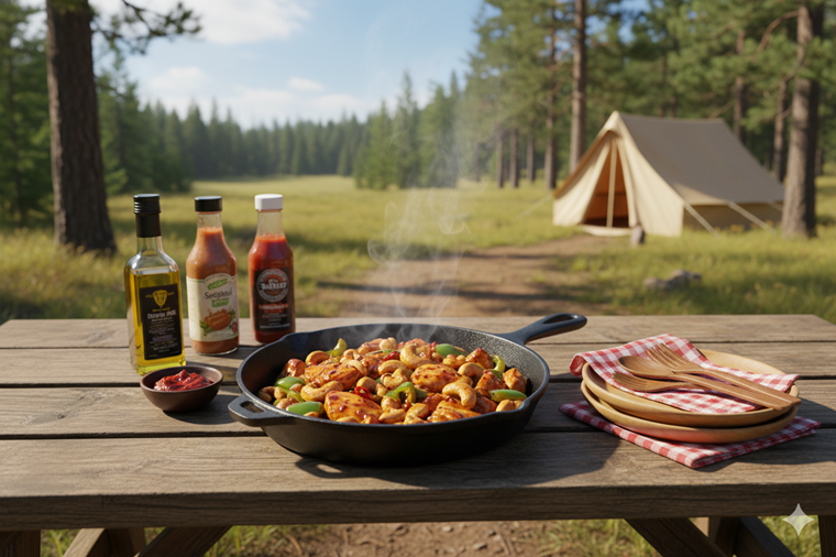 スパイシーな味付けとカシューナッツのカリッとした食感がクセになる、スタミナ満点の炒め物です。スキレットの優れた蓄熱性を活かして鶏肉の表面を香ばしく焼き上げることで、本格的な中華風の味わいをアウトドアで手軽に楽しむことができます。ビールや炭酸飲料との相性も抜群です。
