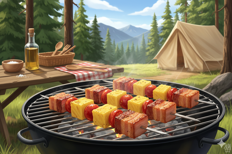 見た目も色鮮やかで、特にファミリーキャンプで子供たちから歓声が上がるのが、厚切りベーコンとパイナップルを交互に刺した串焼きです。ベーコンの塩気とパイナップルのジューシーな甘酸っぱさが口の中で絶妙なハーモニーを奏でます。