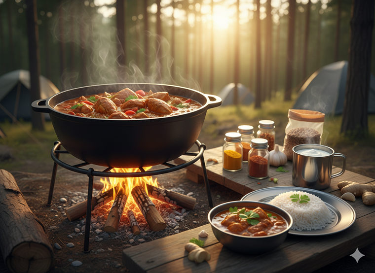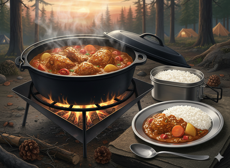 野菜の水分だけで煮込むことで、食材の旨味が凝縮された濃厚なカレーが作れるのが、ダッチオーブンの魅力です。 蓋の重さが圧力効果を生み、鶏肉は驚くほどホロホロに、野菜はトロトロに仕上がります。 焚き火や炭火でじっくりと火にかける時間そのものも、キャンプの醍醐味となるでしょう。