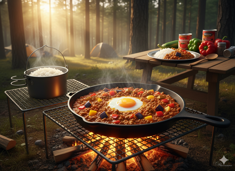 煮込み時間が短く、焚き火の香ばしい風味が食欲をそそるキーマカレーは、特に夏キャンプにおすすめです。ナスやパプリカ、ズッキーニなど、彩り豊かな夏野菜をたっぷり使えば、見た目も華やかになります。温泉卵をトッピングすれば、まろやかさが加わり、子どもから大人まで楽しめる一品に。
