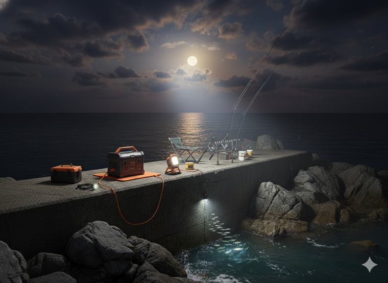 夜釣りや、夜明け前の「朝まずめ」、日没後の「夕まずめ」といった薄暗い時間帯は、絶好のチャンスタイムであると同時に、危険も伴います。ポータブル電源があれば、ヘッドライトやランタンの充電切れを心配する必要がなくなるのはもちろん、家庭用コンセント(AC出力)を利用して大光量のLED投光器や集魚灯を長時間安定して使用できます。