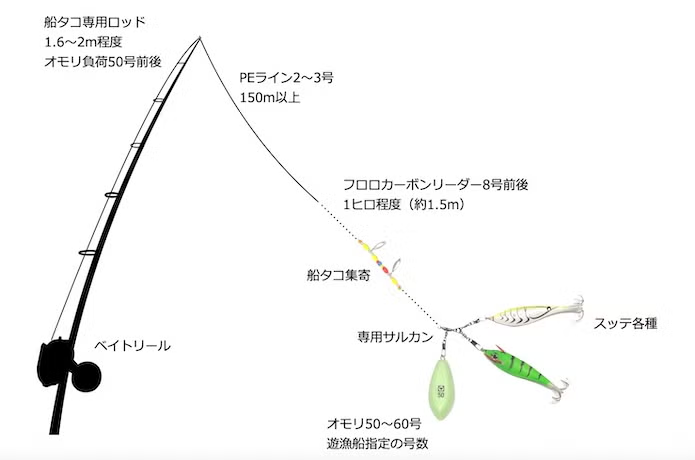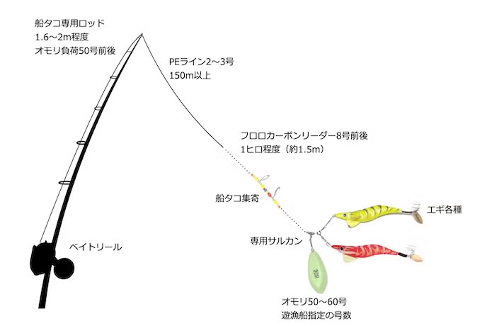 東京湾の船タコは「PE3〜4号 × 30〜80号のオモリ」を基準に、潮が速い・仕掛けが流される、と感じたら迷わずワンランク重くするのが糸絡み防止と手返し向上のコツです。