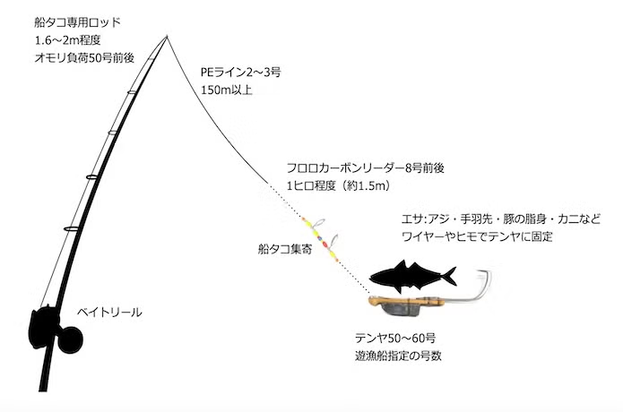 東京湾では、エサの匂いとボリュームで抱かせる「船タコテンヤ」と、手返しよく広範囲を探れる「タコエギ」の二本柱が主流です。状況や船宿のレギュレーション(エギ本数、オモリ号数、装飾量など)に合わせて選びましょう。