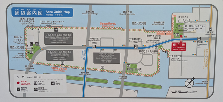 ちなみ下記地図のライニングコースは、豊洲ぐるり公園施設になり、多くの釣りスポットはこのランニングコース沿いになります。